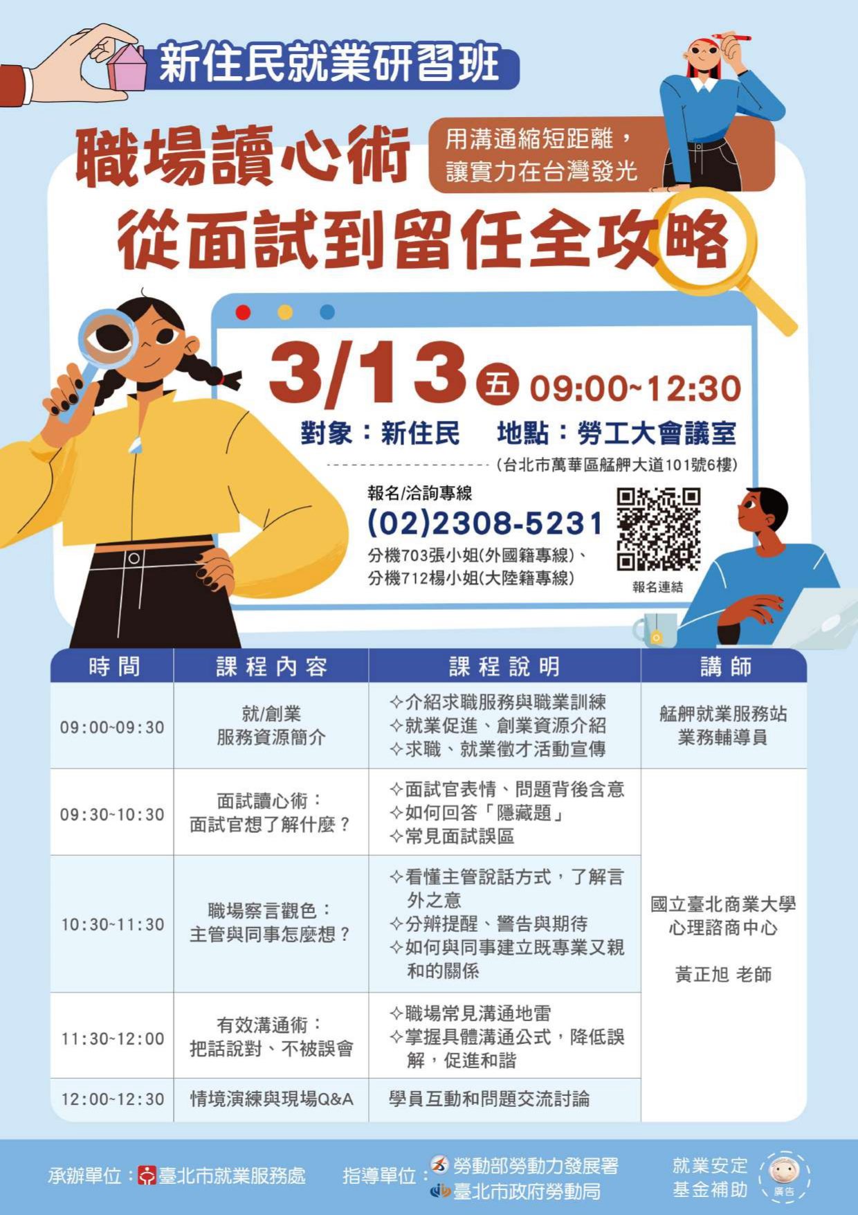 許多擁有豐富經驗的新住民在進入台灣職場後,常因不熟悉「高語境」的文化溝通與潛規則,導致「聽不懂主管弦外之音」、「不知道如何與同事溝通」或「提出問題卻無法被理解」等適應困境,臺北市就業服務處辦理115年度第1場新住民就業研習班,針對新住民常見職場困境量身設計,以「職場的察言觀色」為核心,透過實用的文化轉譯與溝通技巧,協助學員消除職場誤解並建立信任感,不僅能有效提升面試錄取率,更協助新住民學員達成「順利就業」到「長期留任」的目標。 課程時間:3/13(五) 09:00-12:30 課程地點:勞工大會議室(台北市萬華區艋舺大道101號6樓) 本次課程邀請國立臺北商業大學 心理諮商中心黃正旭講師,分享面試官心理與提問深意解析、職場潛規則與高效溝通策略等課程議題,歡迎新住民朋友踴躍報名參加,詳情請至台北就業大補帖網站或電洽02-23085231分機703張小姐;712楊小姐。